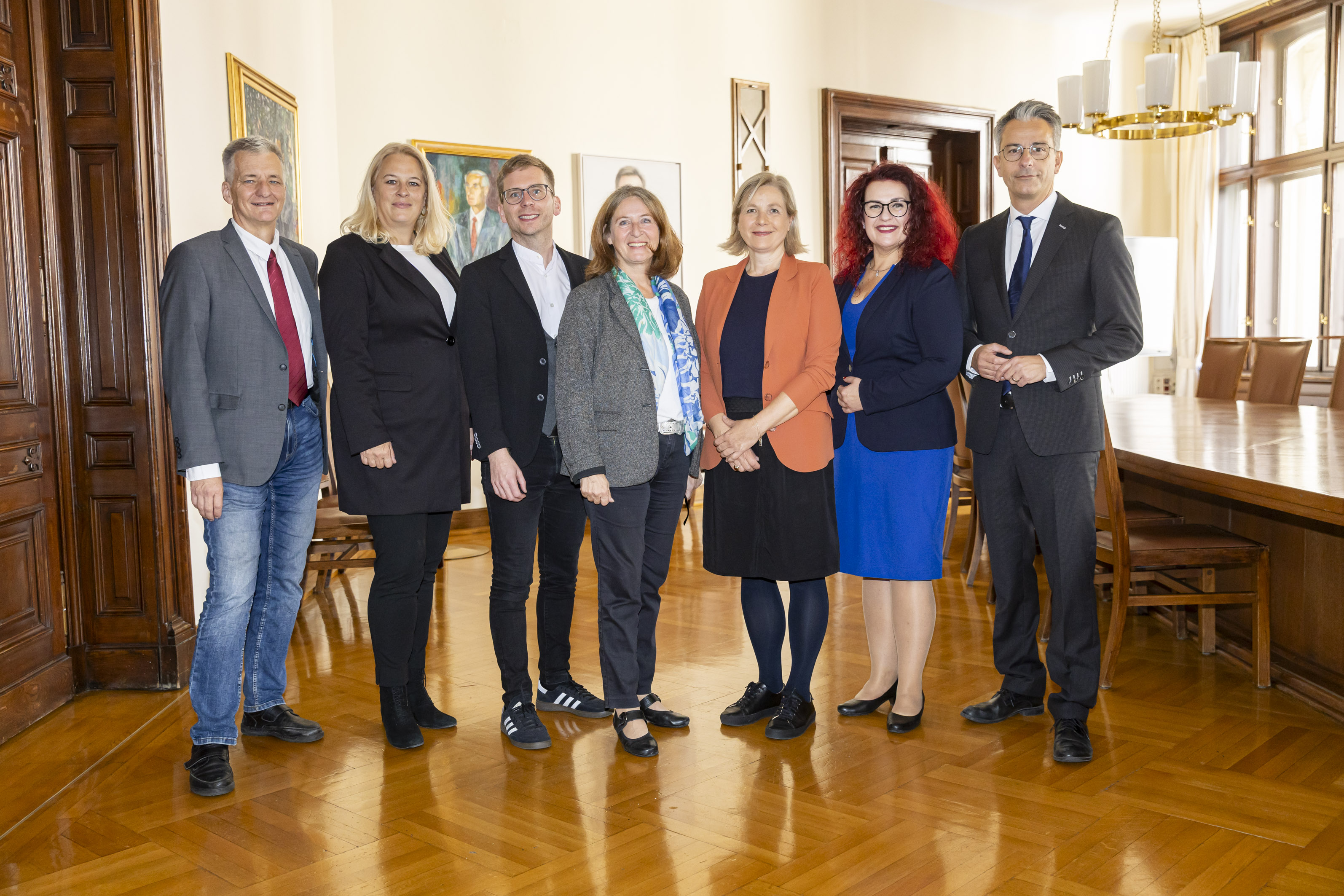 Die Stadtregierung, von links: StR Manfred Eber, StRin Claudia Unger, StR Robert Krotzer, Bgm.in Elke Kahr, Bgm-StVin. Judith Schwentner, StRin Claudia Schönbacher, StR Kurt Hohensinner / Nov. 2025