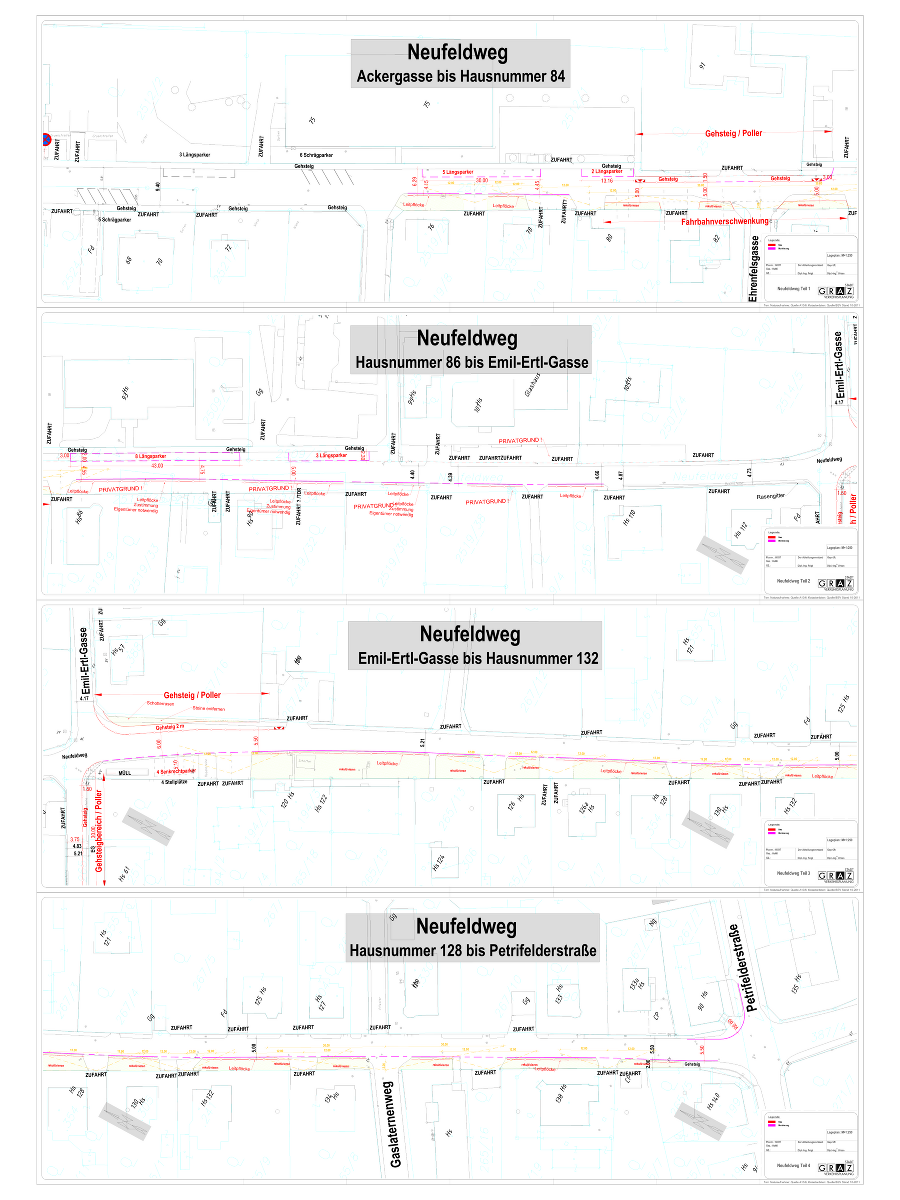Vorerst sollen die geplanten Gehsteige mittels Markierung (Randlinie) und Kunststoffpoller errichtet werden, um eine schnelle Umsetzung zu gewährleisten. Anschließend sollen die Gehsteige Schritt für Schritt baulich errichtet werden.