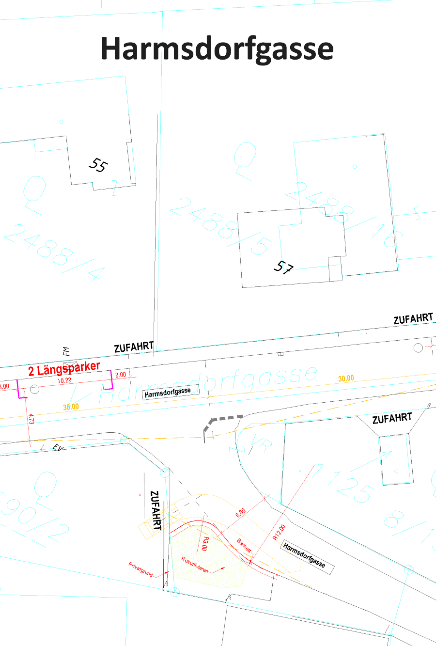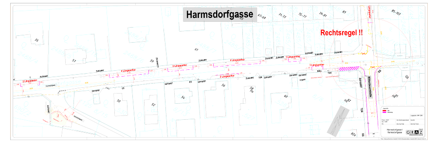 • Harmsdorfgasse - Harmsdorfgasse: Im Zuge der Sanierung der Fahrbahn wird dieser Kreuzungs- und Zufahrtsbereich durch Verkleinerung der Asphaltflächen übersichtlicher und sicherer gestaltet. Die bestehende Grünfläche kann vergrößert werden.