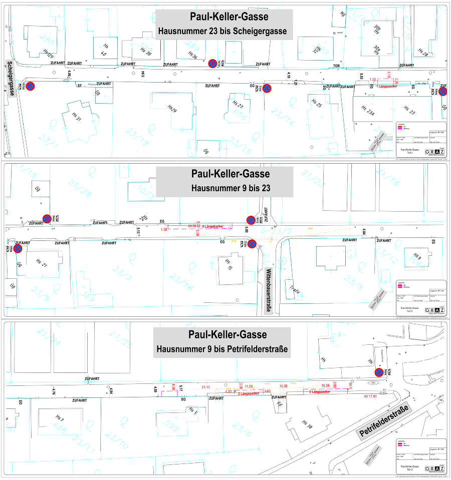 Daher wird im schmalen Abschnitt der Scheigergasse (nördlich der Zufahrt zu Hausnummer 125) nur mehr der Geh- und Radverkehr gestattet. Damit ist die Durchfahrt für Autos in diesem Abschnitt der Scheigergasse nicht mehr möglich.