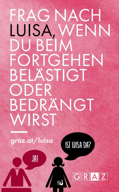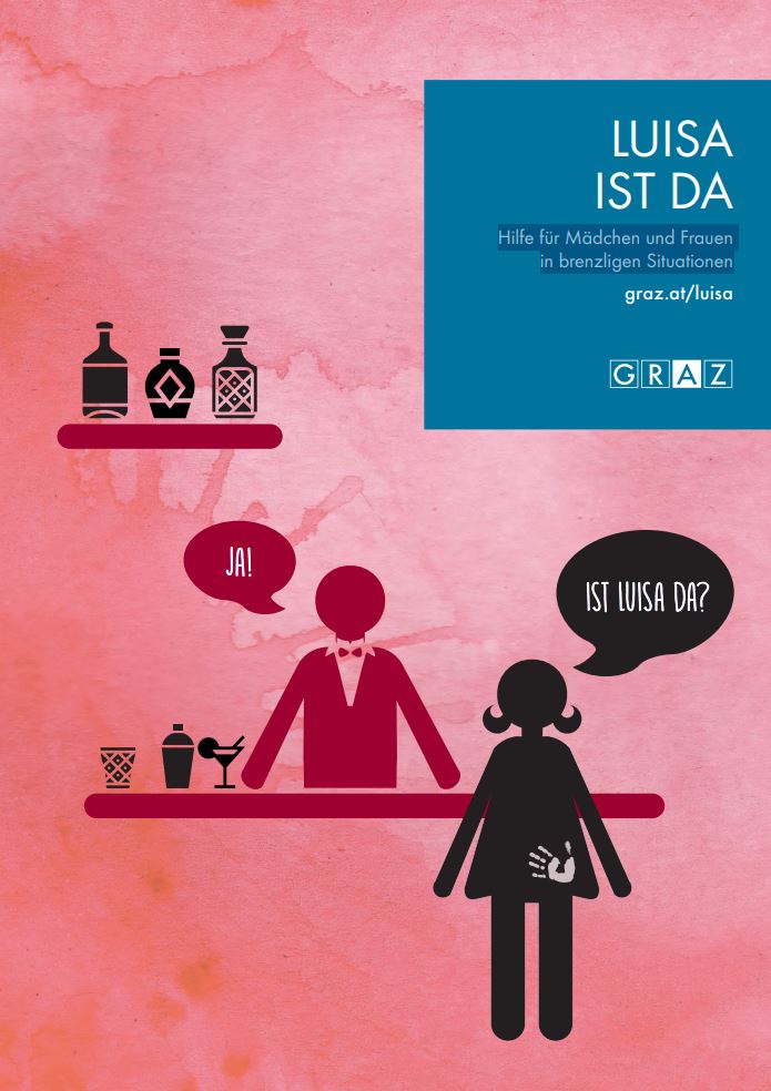 Beschreibung: In ausgewiesenen „Luisa-Lokalen" sorgt das Personal dafür, dass für Anmachen und sexuelle Übergriffe kein Platz mehr ist! Frag einfach eine:n Mitarbeiter:in "Ist Luisa da?" und dir wird diskret aus einer brenzligen Situation geholfen. Der Folder Luisa ist da. Wenn du Sie brauchst! fasst alle wesentlichen Informationen zu dieser Sicherheitskampagne für dich zusammen.
