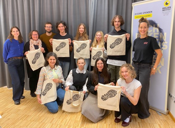 Am Anschluss ging es in Praxis menschenrechtlicher Arbeit mit einem Workshop am Odilien-Institut: Dabei stand vor allem die Sensibilisierung für die Lebensrealitäten von blinden und sehbehinderten Menschen im Vordergrund. Zunächst wurde mit verschiedenen Brillen getestet, wie sich verschiedene Sehbeeinträchtigungen auf das eigene Sehvermögen auswirken. Später wurde mit Augenbinden in Zweier-Teams erprobt, wie eine gute Blindenführung gelingt. Besonders spannend wurde es beim „blinden" Kuchenessen und anschließenden Geschirrspüler-Einräumen. Auch die Präsentation des Blindenfußballs brachte einige zum Staunen und Schmunzeln.
