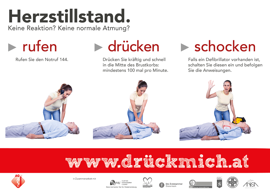 Im Ernstfall erste Hilfe zu leisten, ist ganz einfach, wie Michael Eichinger, Hauptorganisator der Initiative „Drück mich!", erklärt: „Ein unerwarteter Herz-Kreislauf-Stillstand geschieht häufig im engsten Umfeld. Wer helfen kann, schenkt Hoffnung auf Zeit mit den Menschen, die uns am Herzen liegen. Es ist ganz einfach: Herzstillstand. ►rufen ►drücken ►schocken!"
