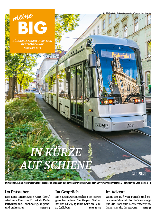 Die November-BIG fährt gleich auf mehrere Top-News ab: Mit Ende November sind erstmal Bim-Garnituren auf der Neutorlinie unterwegs, die Koralmbahn ist im Anrollen und mit dem Energiewerk Graz (EWG) entsteht ein Zentrum für lokale Kreislaufwirtschaft. Weiters: Das Stadtarchiv erprobt die Archivierung von E-Akten, ein Andritzer Ehepaar feierte seine Kronjuwelenhochzeit und blätterte für die BIG im Album der Erinnerung, die unterschiedlichen Grazer Straßenarten werden erklärt und vieles mehr.