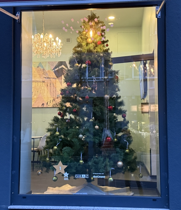 Im Schaufenster sorgt ein prächtig geschmückter Weihnachtsbaum für winterliche Stimmung und lädt Besucher:innen herzlich ein, ihre Entdeckungstour zu starten.