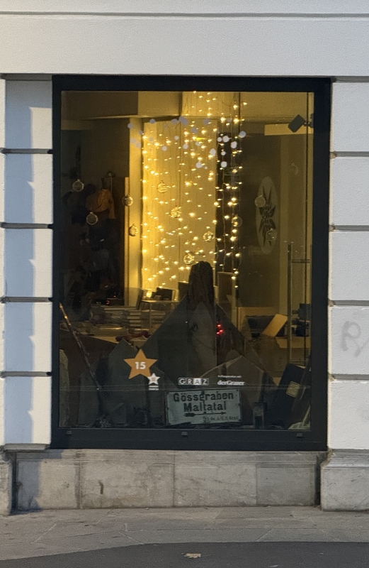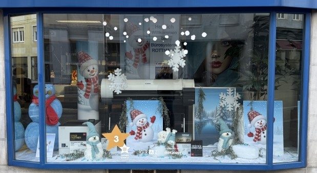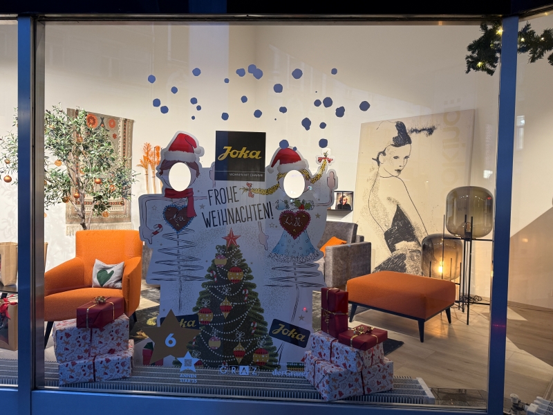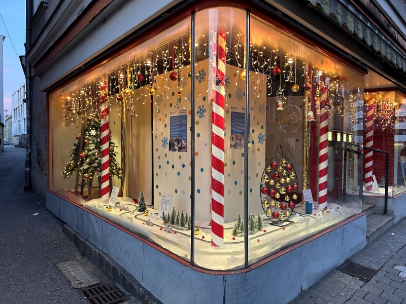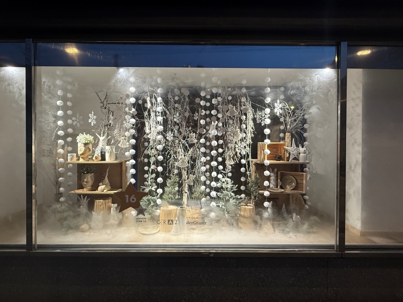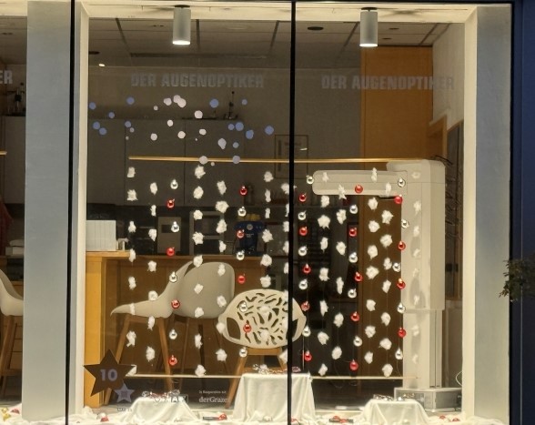 Im Schaufenster funkeln Schneeflocken und Christbaumkugeln um die Wette und verbreiten winterlichen Zauber für alle Besucher:innen.