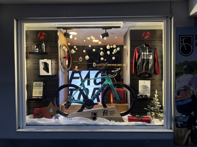 Im Schaufenster präsentiert RadAktiv ein erstklassiges Bike in winterlicher Landschaft - ein kleiner Hinweis darauf, dass Radfahren auch in der kalten Jahreszeit Spaß macht.