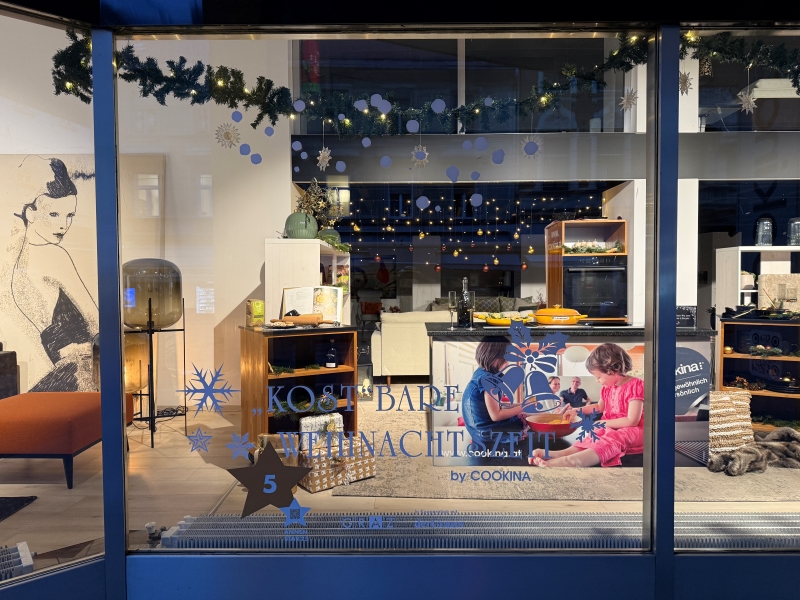 Im Schaufenster präsentiert Cookina liebevoll arrangierte Küche in der sich alles um die Weihnachtszeit dreht. Ein Blick hinein inspiriert zum Kekse backen und Vorbereitungen für das Weihnachtsmenü zu treffen.