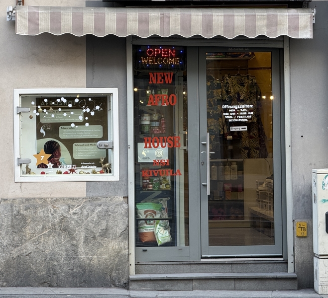Im Schaufenster lädt eine festlich dekorierte Auslage dazu ein, in die bunte Welt afrikanischer Küche, Kultur und Schönheit einzutauchen.