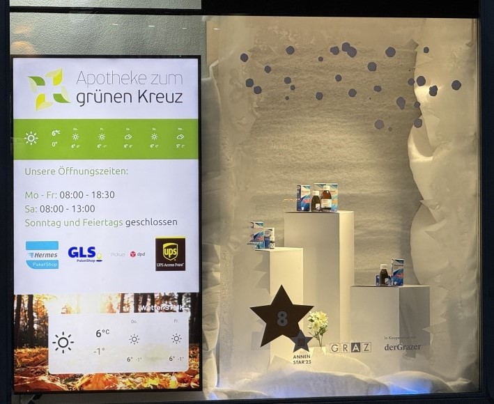 Das Unternehmen mit den meisten Einsendungen gewinnt das Publikumsvoting. Eine Jury bewertet die beste Umsetzung des Themas „Kreativ winterliche Gestaltung des Schaufensters". Die drei schönsten Auslagen werden mit dem AnnenStar Award 2025 sowie einer Unternehmenspräsentation im Grazer im Gesamtwert von 10.590 € ausgezeichnet.