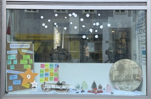 JUKUS ist seit über 20 Jahren in Graz aktiv und setzt Projekte in den Bereichen Kultur, Stadtteilarbeit, Soziales, Gesundheitsförderung und Jugend um. Die Angebote richten sich an unterschiedliche Bevölkerungsgruppen und fördern gesellschaftliche Partizipation, Diversität und Gleichbehandlung - Themen, die auch das weihnachtliche Dorf in Miniatur in den Mittelpunkt der Schaufenstergestaltung rückt.