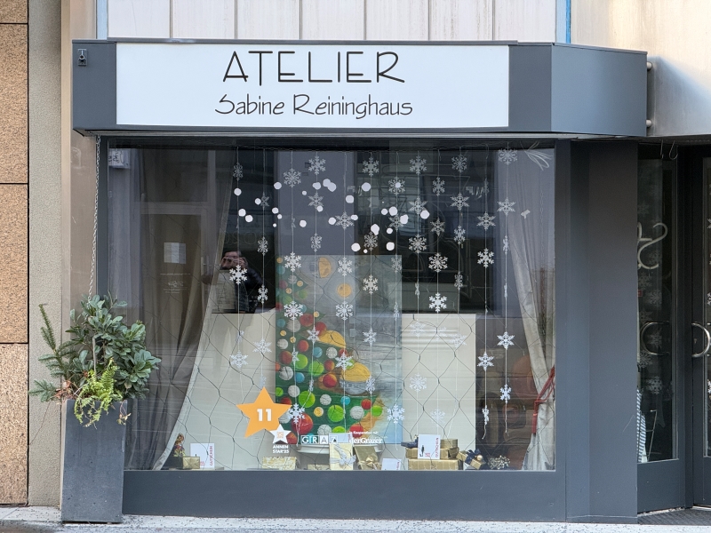 Die Galerie Blaues Atelier vereint zeitgenössische Kunst mit den Schwerpunkten Biodiversität und Natur in Form von Keramik, Malerei, Grafik, Bildhauerei, Reliefs, Objekten und Installationen. Auch Fotografien und Malerei als Einzelwerke regionaler, nationaler wie internationaler Künstler:innen lassen sich in der Galerie finden lassen sich in der winter-weihnachtlich dekorierten Auslage finden.