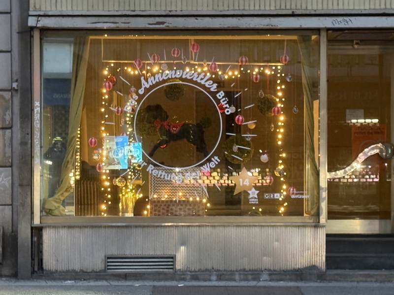 Das ANNENViERTLER Büro zur Rettung der Welt hat gemeinsam mit BASE Graz und dem Bohemian Soul Beehive ein Weihnachtsfenster gestaltet, das ganz im Zeichen von Wiederverwendung und Feminismus steht. Die Installation rückt die laufenden Bemühungen in den Mittelpunkt, eine gerechtere Welt zu schaffen - eine Welt, die sich sowohl um die Menschen als auch um den Planeten kümmert.