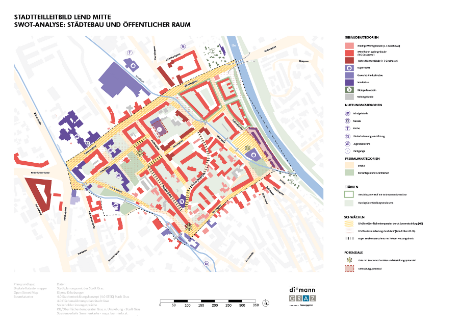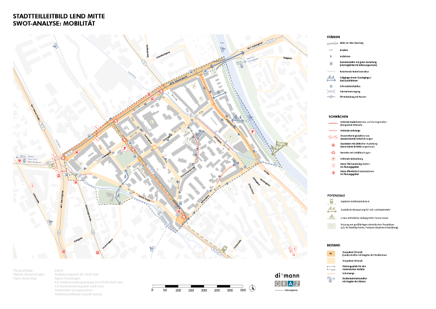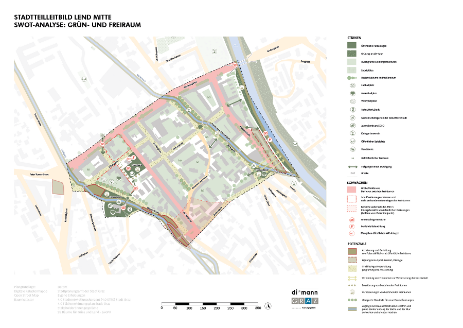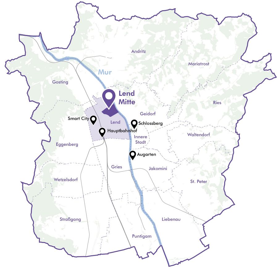 Das Projektgebiet „Lend Mitte" umfasst eine Fläche von etwa 29 ha. Die Rahmung durch Mühlgang und Mur und der zentral durch das Gebiet laufende Schleifbach prägen den besonderen Charakter des Stadtteils. Die hohe Bevölkerungsdichte und bauliche Struktur des Stadtteils erfordern daher einen besonderen Schwerpunkt auf den öffentlichen Raum, Grünräume und die Freiraumvernetzung. Als Ergebnis beinhaltet das Stadtteilleitbild daher viele Ideen zur Verbesserung der Freiraumversorgung, der Qualitäten im öffentlichen Raum und der Erlebbarkeit der Gewässer im Stadtteil.