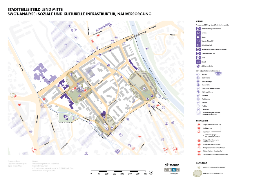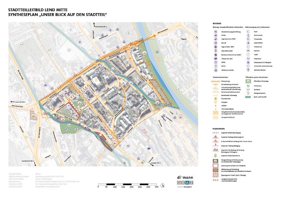Der Syntheseplan stellt unter dem Motto „Unser Blick auf den Stadtteil" die Perspektive der Stadt Graz auf den Stadtteil Lend Mitte dar. Er zeigt einerseits die Bestandssituation (Ist-Zustand) im Stadtteil hinsichtlich sozialer Infrastruktur, Nahversorgung und Gastronomie, Verkehrsinfrastruktur sowie öffentliche Grünanlagen. Andererseits sind auch bereits geplante Projekte und Entwicklungen im Stadtteil sowie Vorgaben aus den übergeordneten Planungsdokumenten der Stadt verortet.