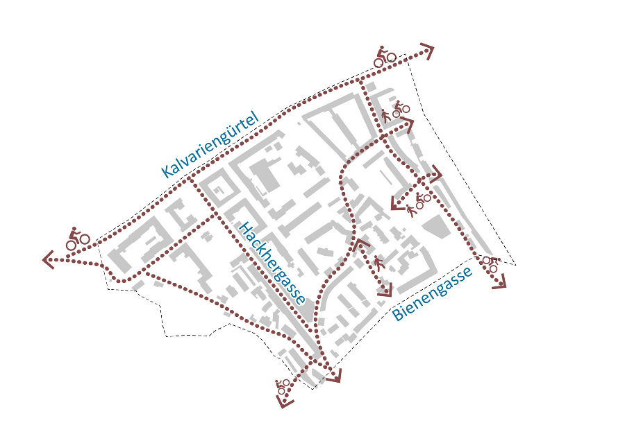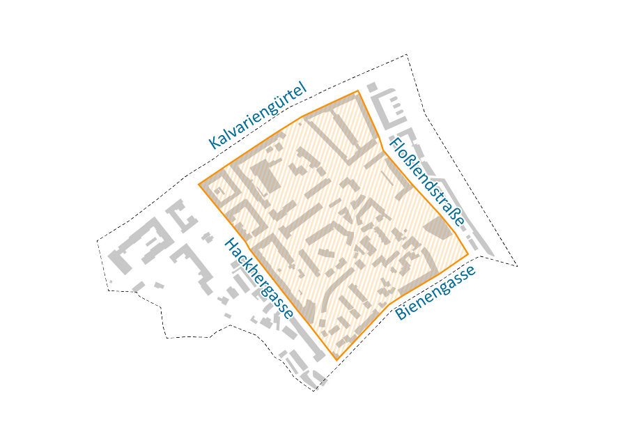 Das Ziel des Handlungsfeldes „Ruhiges Wohngebiet" ist der Erhalt und Ausbau des verkehrsberuhigten Charakters und eine Aufwertung der Straßenräume zwischen Kalvariengürtel, Floßlendstraße, Bienengasse und Hackhergasse.