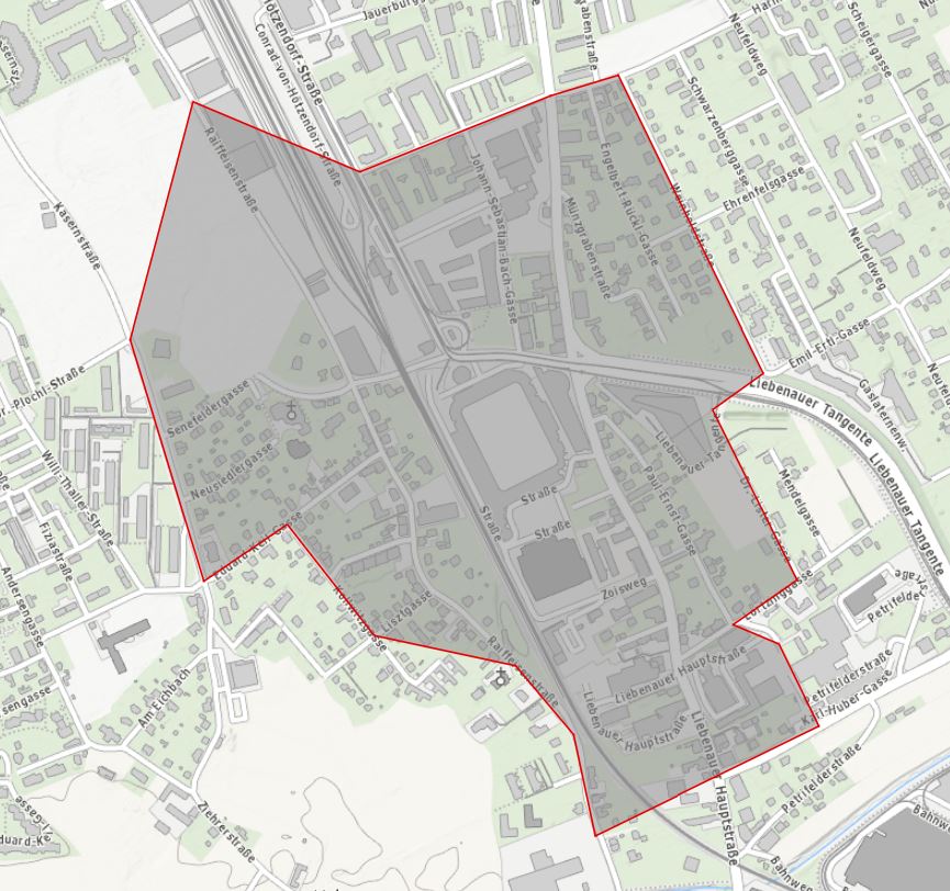 Conrad-von-Hötzendorf-Straße Nr. 151 - Evangelimanngasse - über Münzgrabenstraße - Harmsdorfgasse bis Nr. 12 (Krzg. Weinholdstraße) - Weinholdstraße bis Nr. 31 - Dr. Lister-Gasse bis zur Krzg. Lortzinggasse - Lortzinggasse bis Krzg. Paul-Ernst-Gasse - Richtung Süden bis Karl-Huber-Gasse Nr. 11 - Richtung Westen bis Raiffeisenstraße Nr. 198 - Raiffeisenstraße Richtung Norden bis Haus Nr. 166 (Kirche) - Richtung Nordwesten bis Krzg. Lisztgasse - Kollowitzgasse - Kollowitzgasse bis Eduard-Keil-Gasse - Richtung Westen bis Kasernstraße - Kasernstraße Richtung Norden bis Senefeldergasse - schräg über Dauerkleingartenanlage bis Raiffeisenstraße Nr. 61 - Conrad-von-Hötzendorf-Straße Nr. 151.