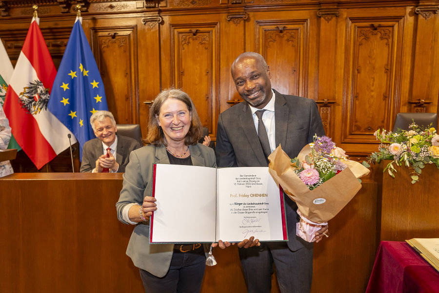 "Wenn man für das, was man gerne tut, ausgezeichnet wird, ist die Freude doppelt groß. Es gibt so viele Menschen in Graz, die diese Ehrung ebenfalls verdient hätten, weil sie mindestens genauso viel für unsere Gesellschaft leisten und dieser Stadt ebenso verbunden sind wie wir. In meinem Wirken geht es immer um gegenseitigen Respekt und Akzeptanz sowie um den Einsatz gegen Rassismus, Vorurteile und Ausgrenzung. Wir alle müssen unseren Beitrag leisten - und manchmal beginnt dieser vielleicht schon mit Zivilcourage. Wir frisch ernannten Bürger:innen wollen und sollen Vorbilder sein, und genau das erwarten wir uns auch von den Politiker:innen. Denn es geht um uns alle und um ein friedliches Zusammenleben in unserer Stadt", so Fred Ohenhen.