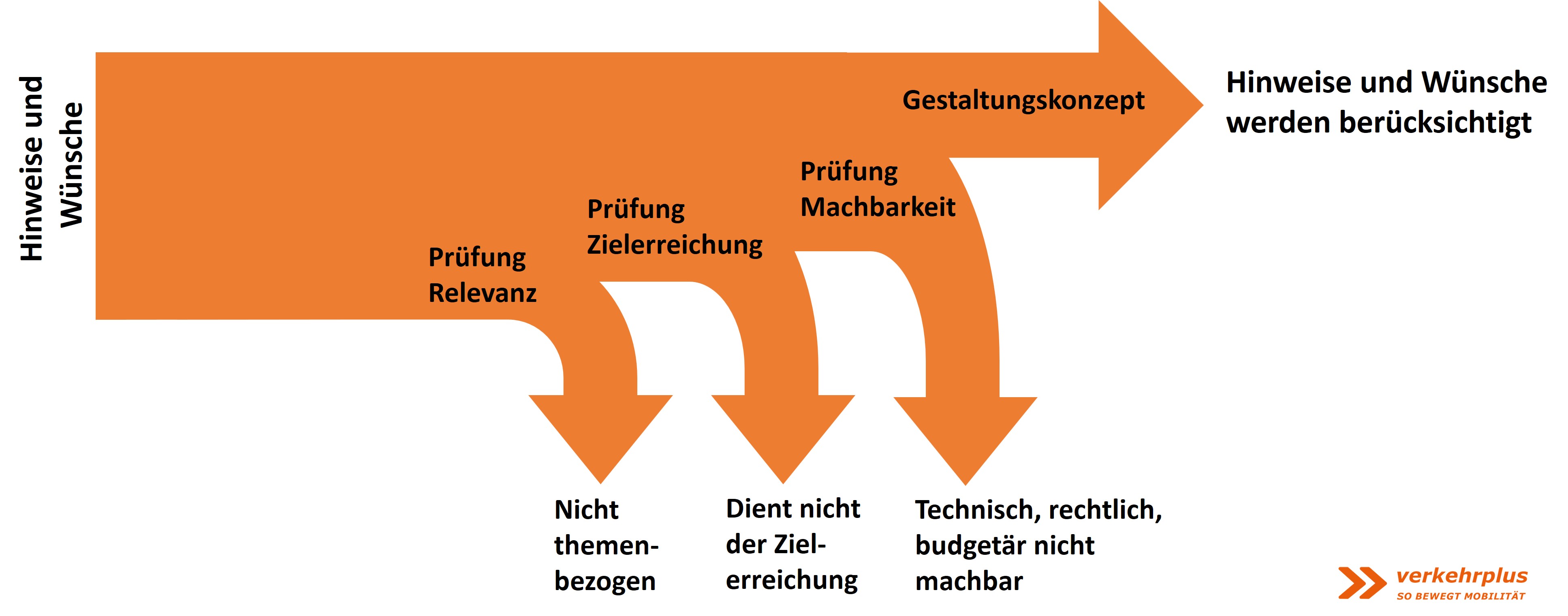 Bevor einzelne Hinweise oder Wünsche in der Planung berücksichtigt werden konnten, war eine mehrstufige Prüfung dieser erforderlich. Die Abbildung zeigt diesen Prüfungsprozesses - der Weg eines Hinweises oder eines Wunschs aus dem Beteiligungsprozess bis zum Gestaltungskonzept.